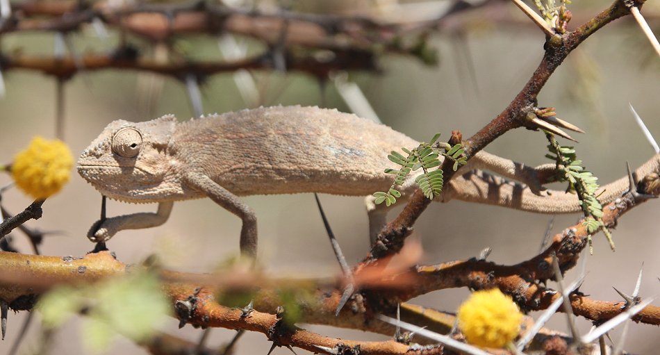 Während ich vom Tusker Markt rüber zu einem kleinen Getränkemarkt schlenderte, entdeckte ich auf einmal ein kleines Site Striped Chamäleon auf einem Drahtzaun. "You can take it!" rief mir einer der Boda Boda Fahrer zu, als ich interessiert stehen geblieben war. Während ich nach dem Chamäleon griff, hielt mir der Motorrad seine offene Hand entgegen. Also erkaufte ich für 50 Kenya Schillinge dem kleinen Reptil die Freiheit. "Hier halt Mal!" drückte ich Holger das Chamäleon in die Hand, als ich wieder am Land Cruiser war und blickte in ein erstauntes Gesicht. Kurze Zeit später hielten wir am Pistenrand und setzten das blase Reptil in eine kleine Akazie und zurück in die Freiheit!