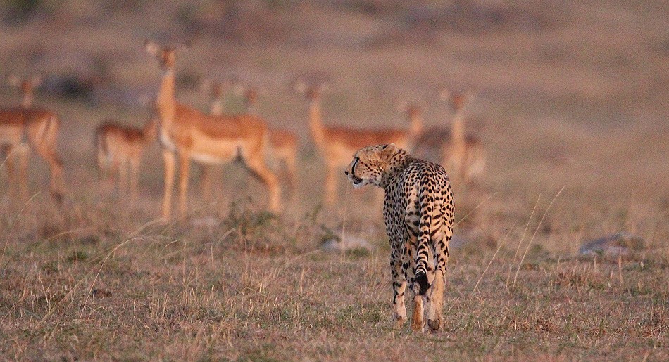 Zum Lunch fuhren wir an diesem Tag in das nahe Bush Camp zurück und da Soraya an diesem Vormittag schon die Giraffen verschlafen hatte gönnten wir uns alle eine kleine Mittagsruhe in unseren Zelten. Was mehr oder weniger gut funktionierte, aber zumindest die Erwachsenen ruhten ein wenig ;-) Am späten Nachmittag entdeckten wir dann die Gepardin wieder, die wir zwei Tage zuvor mit einem prall gefüllten Bauch beobachtet hatten, als sie satt an den reihen der Impalas vorbei gezogen war. An diesem Nachmittag sah die Situation nun ganz anders aus, die Gepardin, die von Elena und ihrem Team auf den Namen Nagol getauft worden war und von der wir nicht nur die Mutter Neema, sondern sogar ihre Großmutter Shakira sehr gut kannten, war ganz offensichtlich hungrig. Wieder fragte ich die Kinder ob sie wirklich einen Kill sehen wollten und Soraya antwortete empört: "Natürlich will ich das sehen, ich bin doch kein kleines Kind mehr und außerdem gehört es zur Wildnis dazu!" Malik hingegen fehlte an diesem Nachmittag etwas die Ausdauer und er sorgte durch seine akrobatischen Einlagen im Dachgestänge des Land Cruisers und den außergewöhnlichen Turnübungen, bei denen er beinahe aus dem Autodach geschaukelt wäre, für einen Nervenkitzel der anderen Art. Wir anderen, verfolgten gespannt die Bewegungen der geschmeidigen Raubkatze. Vorsichtig und immer wieder in ihrer Bewegung verharrend, näherte sich die Gepardin einer Gruppe Thomson Antilopen. "Noch ist sie für einen erfolgreichen Angriff zu weit von den Gazellen entfernt!" erklärte ich, als die Gepardin unter Ausnutzung des Geländes dichter an die Pflanzenfresser heran schlich. Die ganze Jagdszene spielte sich unweit einer der Hauptpisten ab und als sich plötzlich zwei große LKW´s näherten, die von einer der Pistenbaustellen gekommen sein mussten, änderte sich die Situation schlagartig. Die Thomsonherde zog weiter und nur ein einzelner Gazellenbock blieb zurück. Aber genau diesen schien sich die schnelle Jägerin ausgesucht zu haben. Bei ihrer weiteren Annäherung sahen wir die Raubkatze aus nächster Nähe. "Ich kann genau sehen, wie sich die Muskeln auf dem Rücken bewegen!" erklärte Soraya fasziniert und genauso gespannt wie wir. Leicht geduckt und immer schneller werdend näherte sich die Gepardin ihrer Beute. Doch dann wurde sie von der scheuen Thomson Gazelle entdeckt und konnte flüchten. Hungrig blieb die Gepardin zurück und wir fuhren zurück zum Mara Bush Camp um eine letzte Nacht in der Wildnis der Mara zu verbringen.