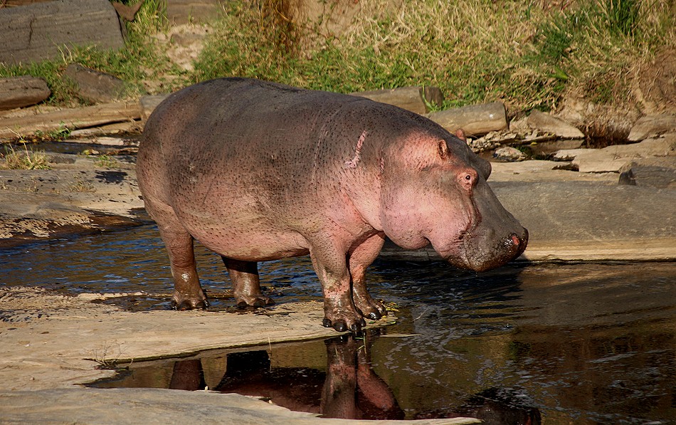 Als sich die erste Staubwolke gelegt hatte nährten auch wir uns dem Flussufer und versuchten noch einen halbwegs nutzbaren Platz zu finden um den Gnus und Zebras bei der Flussüberquerung zuzusehen. Auch wenn die Position nicht Preisverdächtig war, so war es doch immer wieder ein ganz besonderes Erlebnis ein Crossing life zu erleben! Den Einstieg der Tiere konnten wir leider nicht sehen, aber wir sahen sie schwimmen, rennen und am gegenüberliegenden Ufer aus dem Fluss klettern. Die Kinder und wir beobachteten staunend, wie die Gnus und Zebras sich gegenseitig beim Herausklettern behinderten, schubsten oder gegenseitig traten. Immer wieder rutschten Gnus oder Zebras auf den glitschigen Felsen ab und fielen zurück in Wasser. Kein einziges Krokodil griff in das Crossing ein, keine Raubkatze ließ sich am Ufer sehen. "Seht ihr, die meisten Gnus oder auch Zebras verletzen sich selber bei der Flussüberquerung und nicht immer kommen Krokodile oder Löwen um sie zu fressen!" erklärte ich den Kindern, als wir nach einer Weile den Schauplatz verlassen hatten um wieder irgend wo eine menschenleerere Ecke des Flusses aufzusuchen.