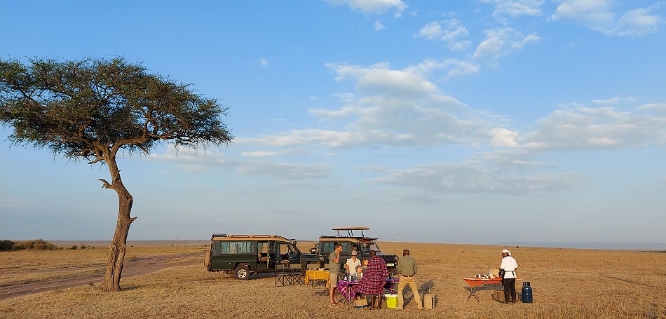 Im Mara Bush Camp angekommen wurden wir gewohnt herzlich von Nelson, dem Manager empfangen. Mr. Nelson, wie Malik ihn fortan betitelte, hielt eine erste Begrüßungsrede und betonte noch einmal, was ich im Vorfeld schon erklärt hatte: "This is an open Camp! We have a lot of wild animals around! Don't run into the bush and don´t do what your grandpa is doing all the time! Do not go down to the river, do not go without an Askari!..." Nachdem ich, bis auf die letzten Sätze, alles für die Kinder übersetzt hatte, zogen wir zunächst einmal in unsere Safarizelte ein und ließen uns dann mit einem leckeren, sehr späten Lunch verwöhnen. Tim bestellte sein erstes Tusker Bier in der Wildnis und Jenny fragte sich, warum sie früher mit uns eigentlich immer Camping machen musste, wenn es doch auch damals schon solche Camps gegeben hatte! Das Soroi Mara Bush Camp liegt in einer Schleife des Ol Are Orok Flusses im Ol Kiombo Gebiet, unweit des gleichnamigen Bush Flugfeldes und zwischen dem sogenannten Smelling und Doppel Crossing Furten durch den Fluß. Grundsätzlich ist das ganze Gebiet sehr wildreich, sodaß Großwildbegegnungen rund um das Camp genauso möglich sind wie im Camp selber. Petra und ich nutzen das Mara Bush Camp seit seiner Gründung und haben so schon viele und auch spannende Momente in diesem für uns authentischen Safari Camp erlebt. Natürliich haben wir im Laufe der Jahre auch die verschiedenen Manager im Camp kennen und schätzen gelernt zu einigen pfelgen wir noch heute einen guten, freudschaftlichen Kontakt. Dabei sind uns der aktuelle Manager Nelson und seine Vorgängerin Leslie besonders ans Herz gewachsen.