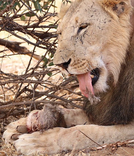 Unsere Aufmerksamkeit galt eher den Raub- und Greifvögeln. Wir versuchten fast immer, Raubadler, Gaukler, Weihen oder Geier im Bild festzuhalten. Am Ende waren es dann auch letztgenannte, die uns zu unserer nächsten Katzensichtung führten. Am Himmel waren uns einige Geier und andere Greifvögel aufgefallen, die nicht nur suchend unter den Wolken kreisten, sondern nacheinander im Sinkflug ein Ziel ansteuerten. Neugierig folgten wir den großen Vögeln und entdeckten einige Geier und Raubadler in einer großen Doumpalme. Da es einen Grund für die Anwesenheit so vieler Greifvögel geben musste, suchten wir am Boden weiter und fanden, was wir geahnt und gehofft hatten. Zwischen den Büschen lief ein großes Löwenmännchen mit einer kleinen Beute im Maul. "Irgendwie etwas löwenunwürdig, aber Mahlzeit ist Mahlzeit!", bemerkte ich, als wir erkannten, dass der Löwe die Reste eines Dik-Diks im Maul trug. Ob er die kleine Antilope selbst erbeutet oder einem schwächeren, kleineren Räuber abgejagt hatte, ließ sich nicht mehr feststellen. Auf jeden Fall legte sich die große Raubkatze neben einen Busch in den Schatten und kaute lautstark auf den Resten des Kadavers herum bzw. lutschte regelrecht auch die kleinsten Knochen ab. Übrig blieben nur ein paar kleine, blanke Knochen. Als der Löwe aufstand und weiterzog, folgten wir ihm entlang der Piste. Plötzlich blieb die kräftige Katze stehen, duckte sich kurz und sprang dann völlig unverhofft kopfüber in einen kleinen Busch. Bevor wir reagieren konnten, flüchtete erneut eine Wildkatze vor unseren Augen und wart nicht wieder gesehen. Wir folgten dem Löwen anschließend, bis er sich in dichtem Buschwerk in den Schatten zurück zog.